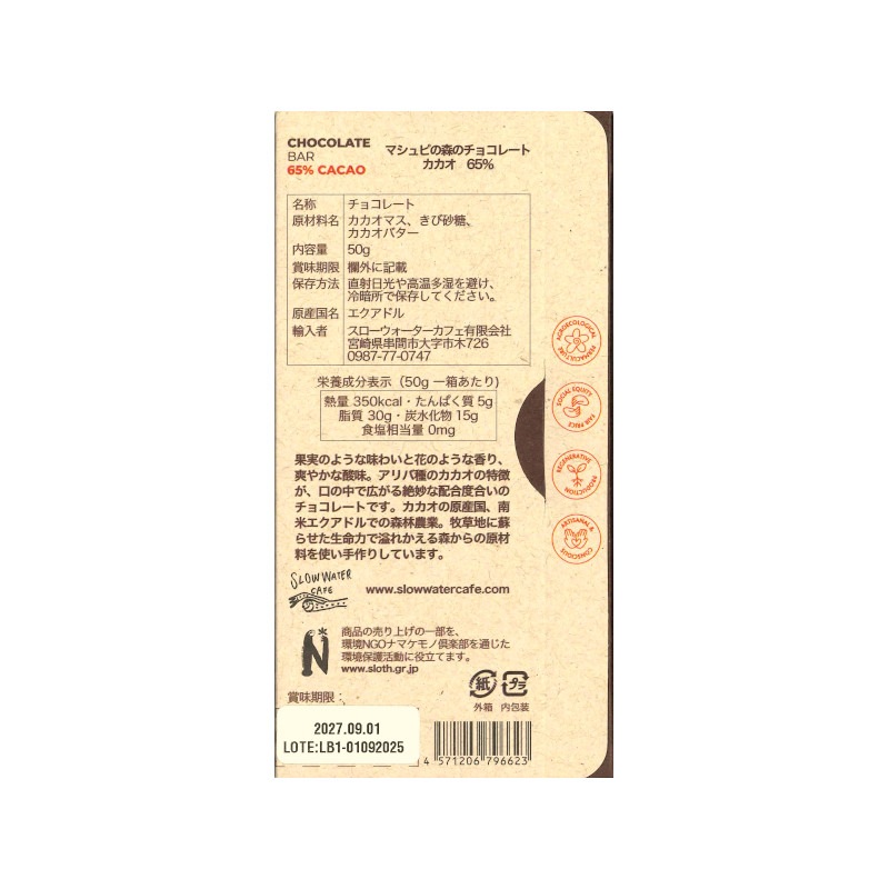 名称 チョコレート 原材料名 カカオマス、きび砂糖、カカオバター 内容量 50g 原産国 エクアドル 保存方法 直射日光や高温多湿を避け、冷暗所で保存してください。 賞味期限 2027/09/01 輸入者 スローウォーターカフェ有限会社