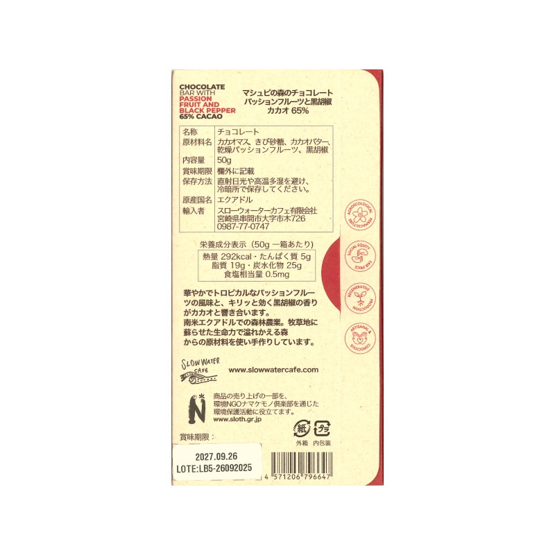 名称 チョコレート 原材料名 カカオマス、きび砂糖、カカオバター、乾燥パッションフルーツ、黒胡椒 内容量 50g 原産国 エクアドル 保存方法 直射日光や高温多湿を避け、冷暗所で保存してください。 賞味期限 2027/09/26 輸入者 スローウォーターカフェ有限会社